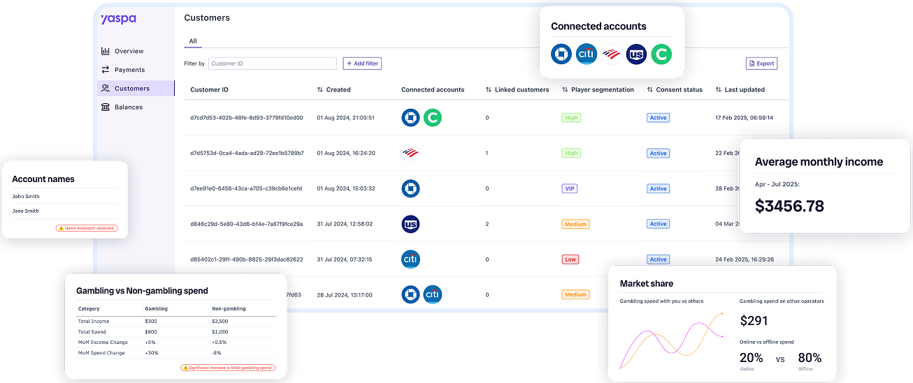 We combine open finance and AI to deliver real-time, actionable insights in a customizable operator dashboard. Yaspa’s award-winning Intelligent Payments solution gives operators a unique view of their players, taken seamlessly at the point of deposit.